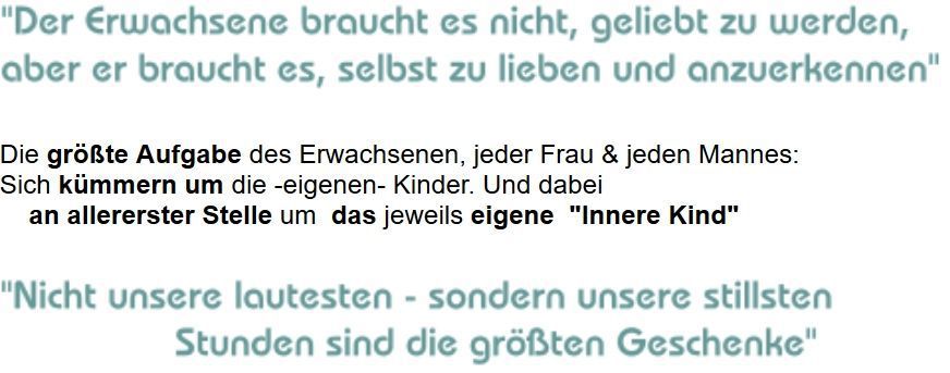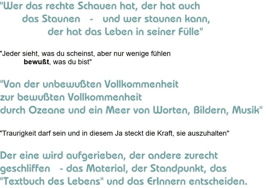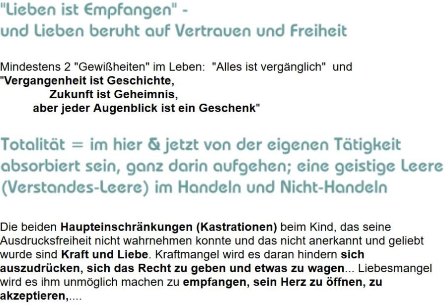 Es ist also auch die Suche nach Werkzeugen, wobei "alles kann als Werkzeug (für mich) oder Waffe (gegen mich oder gegen andere) genutzt werden".Es geht um ein immer mehr im eigenen Innern sein - und von dort heraus dann mehr und mehr mit der Existenz in einem Austausch von Empfangen und Schenken zu sein.